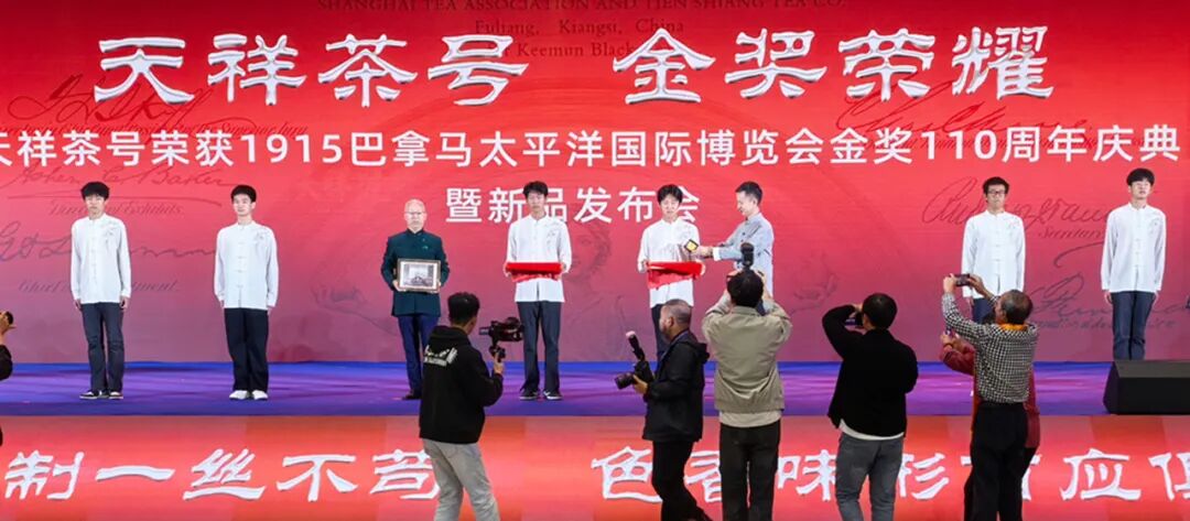 于是“金牌精神”就成为今天的天祥茶号的企业精神,也正因为有了这股茶号精神,在行业一片萧瑟之际,天祥茶号在2025景德镇陶瓷博览会上,高高竖起天祥茶号旗帜,举办了一场堪称豪华的世纪庆典,不仅为浮梁茶出头争脸,也为赣茶吼出了一声“呐喊”。