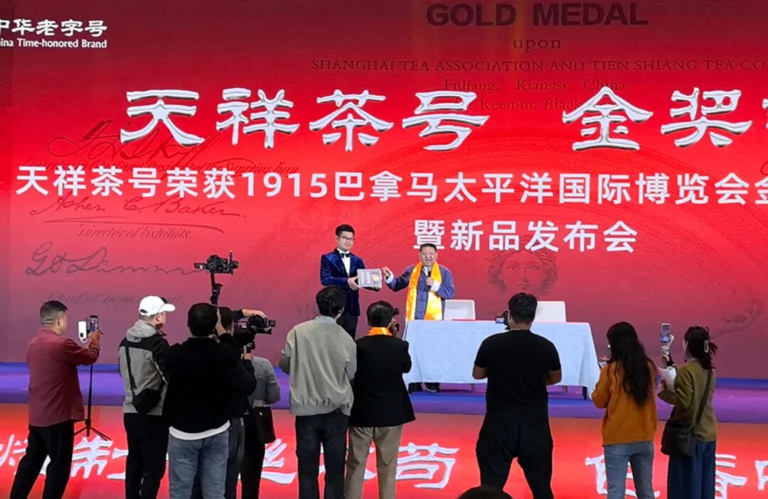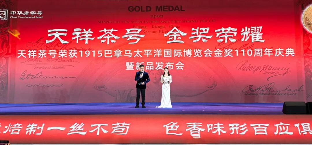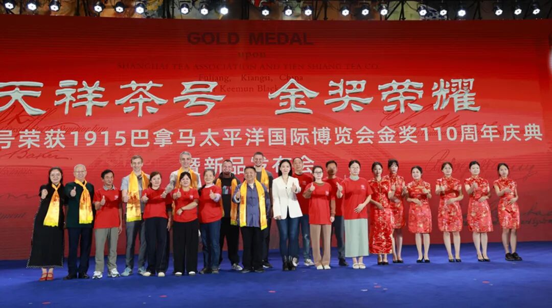 于是“金牌精神”就成为今天的天祥茶号的企业精神,也正因为有了这股茶号精神,在行业一片萧瑟之际,天祥茶号在2025景德镇陶瓷博览会上,高高竖起天祥茶号旗帜,举办了一场堪称豪华的世纪庆典,不仅为浮梁茶出头争脸,也为赣茶吼出了一声“呐喊”。